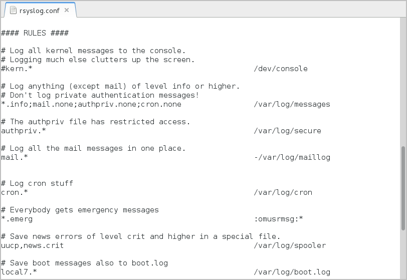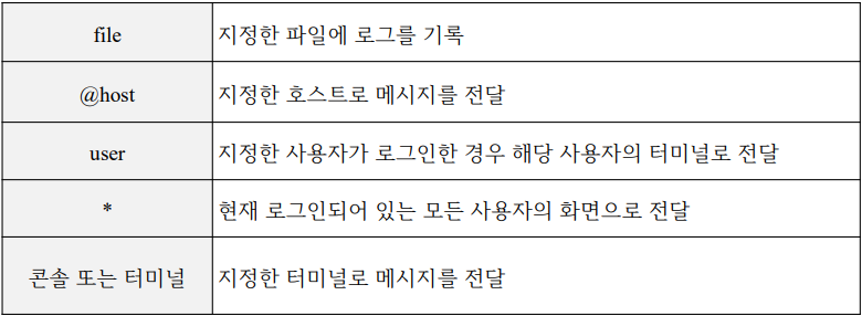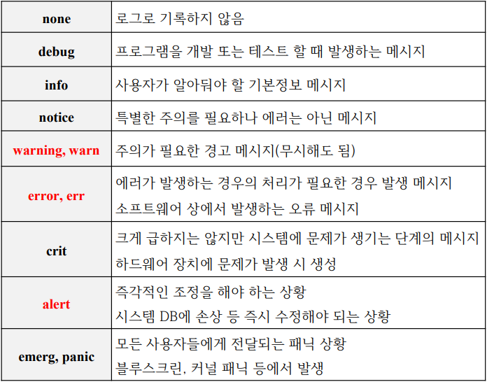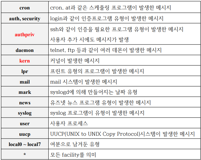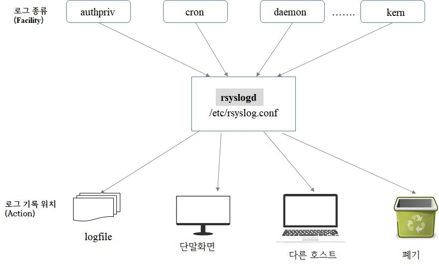 - rsyslogd 데몬은 /etc/rsyslog.conf 설정파일을 참조하여 로그를 남김