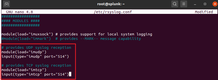 rsyslog가 udp/tcp를 모두 수신하도록, 주석이 있다면 지워준다.