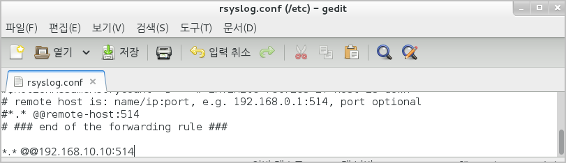 • 시스템에서 발생하는 모든 종류의 로그를 192.168.10.10:514로 TCP/UDP를 이용해 전송한다.