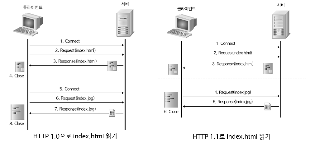 이 때 HTTP 1.1은 텍스트/이미지에 대한 연결을 따로 설정하지 않고 연속해서 전송한다.
