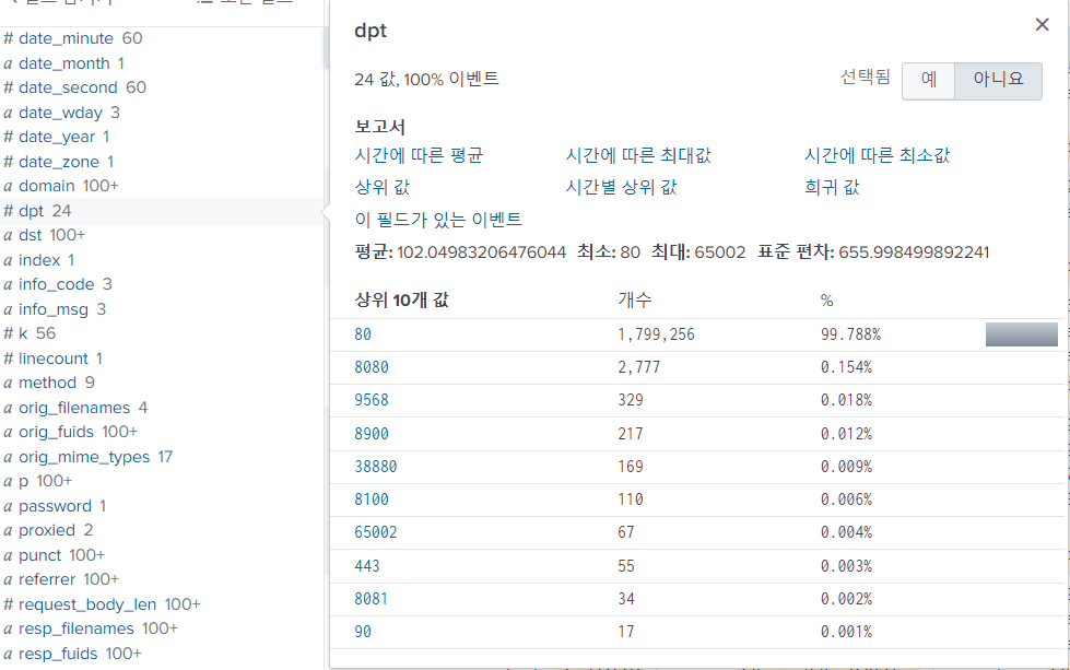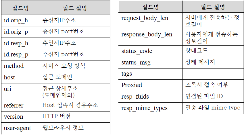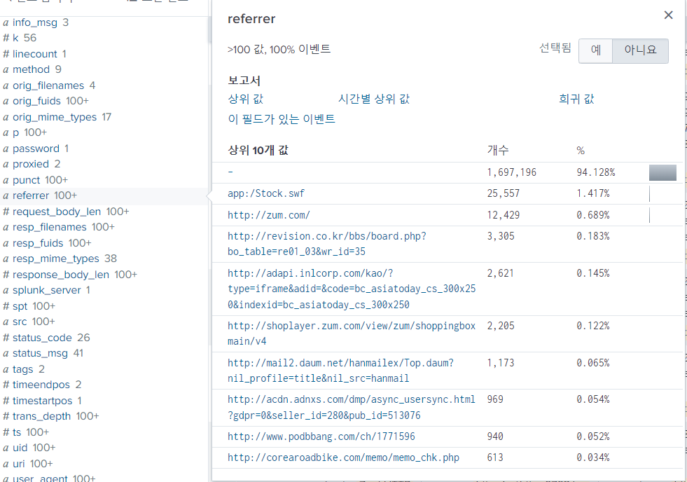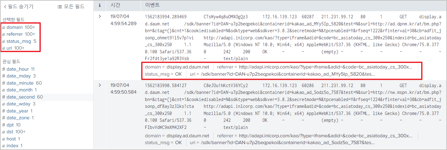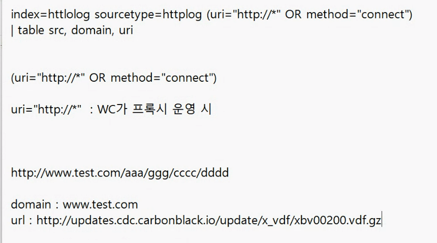 - 송신지IP, 접속한 도메인, uri 필드를 테이블로 출력