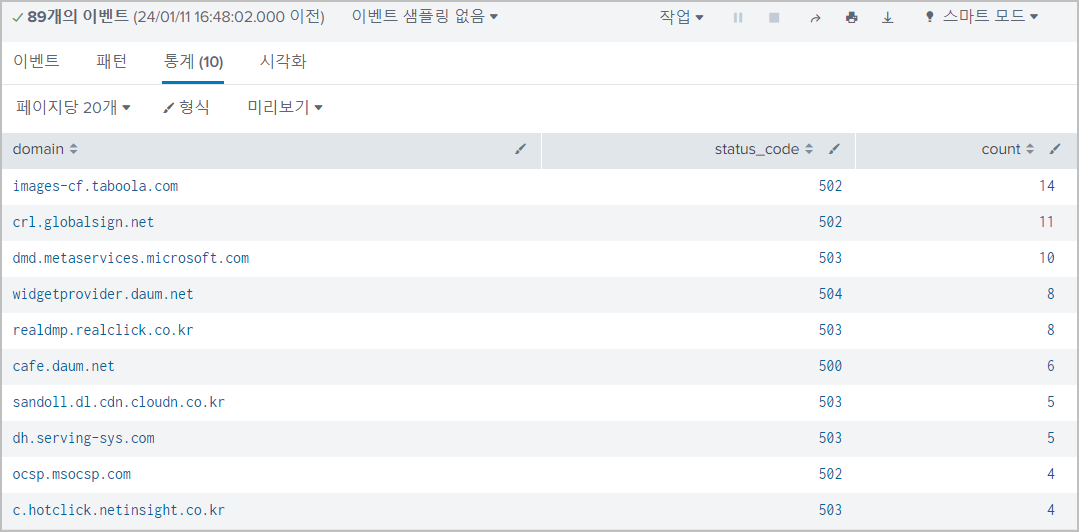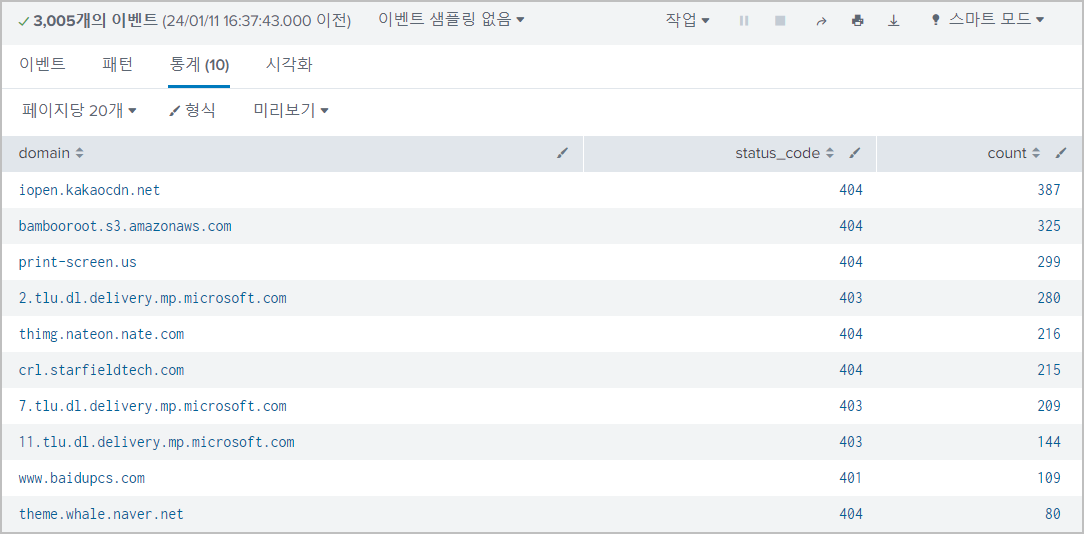 - 도메인, 상태 코드 필드 기준 가장 많은 이벤트 Top 10 출력