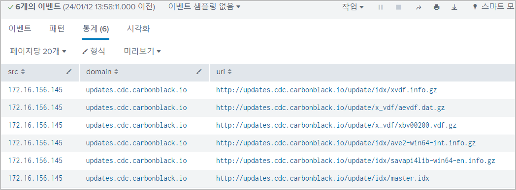 - domain, uri, filename, filetype, resp_mime_types 필드를 테이블로 표시한다