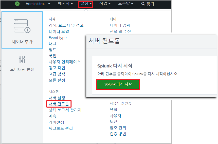 설정 > 서버 컨트롤 > Splunk 다시 시작