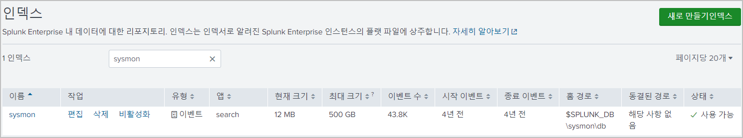 그 결과, sysmon 인덱스가 반영되었고, index=sysmon 검색이 잘 수행된다.