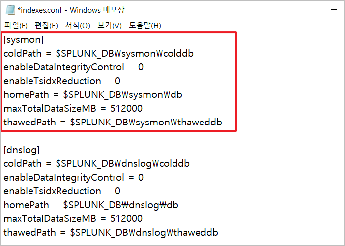| [sysmon] coldPath = $SPLUNK_DB\sysmon\colddb enableDataIntegrityControl = 0 enableTsidxReduction = 0 homePath = $SPLUNK_DB\sysmon\db maxTotalDataSizeMB = 512000 thawedPath = $SPLUNK_DB\sysmon\thaweddb |