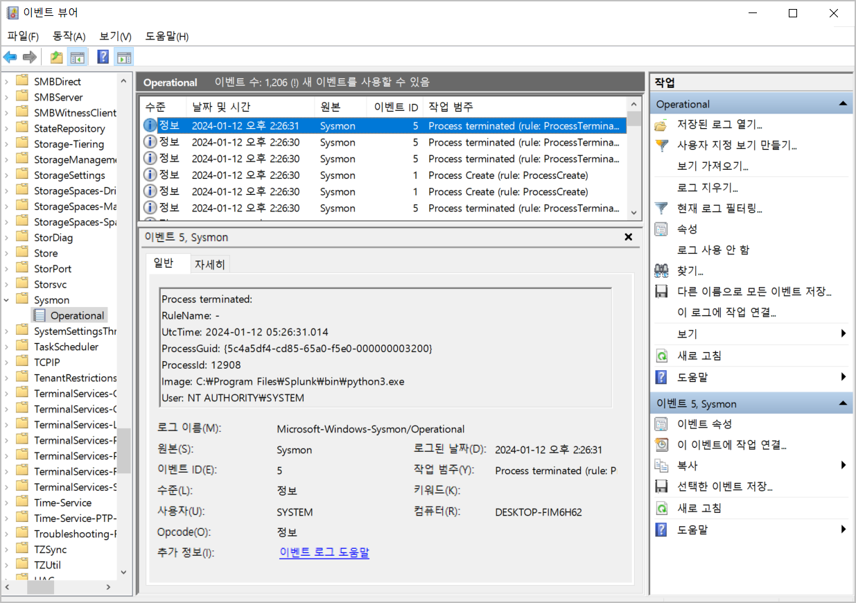 이벤트 뷰어 > 응용 프로그램 및 서비스 로그 > Microsoft > Windows > Sysmon > Operational