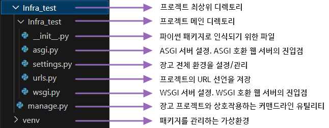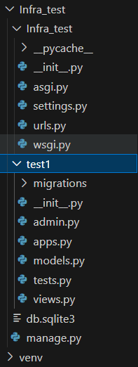 이 경우 위와 같이 Infra_test/Infra_test와 같이 디렉터리 밑에 똑같은 이름의 앱 디렉터리가 생성된다.