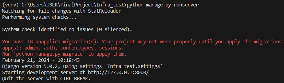 장고 서버가 http://127.0.0.1:8000/로 시작되었고